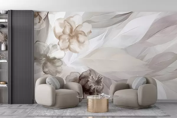 Fototapetak Finom virágok és levelek a fehér, barna és bézs árnyalataiban virágos háttér , lágy színek, finom szirmok Nr. w09111v1