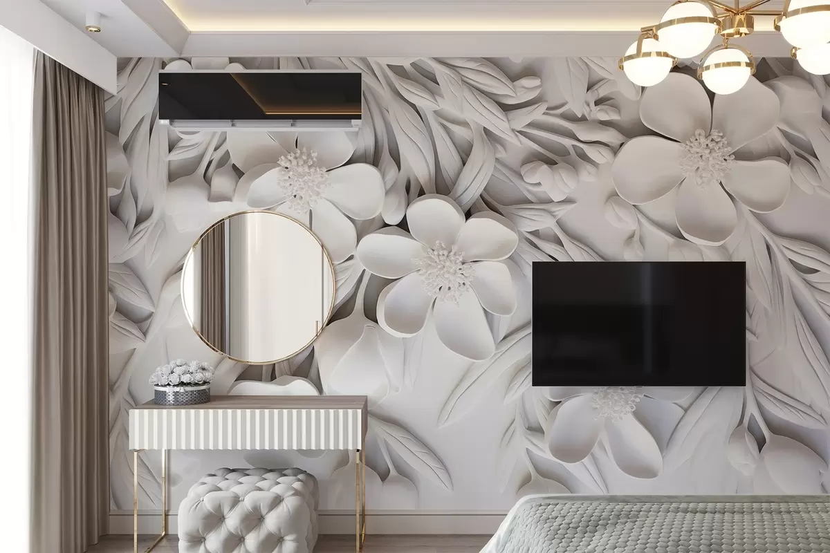 Fototapetak Fehér virágok és levelek fehér háttérben, virágos elegáns, dekoratív design, bonyolult részletek Nr. w09113