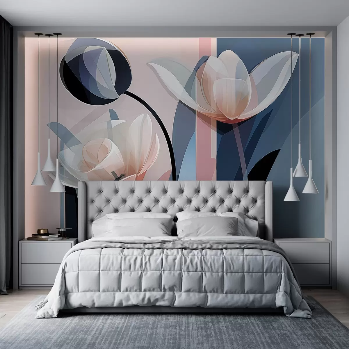 Fototapetak Absztrakt modern design tulipánokkal, átlátszó szirmokkal a rózsaszín, a fehér és a sötétkék pasztell árnyalataiban Nr. w09116