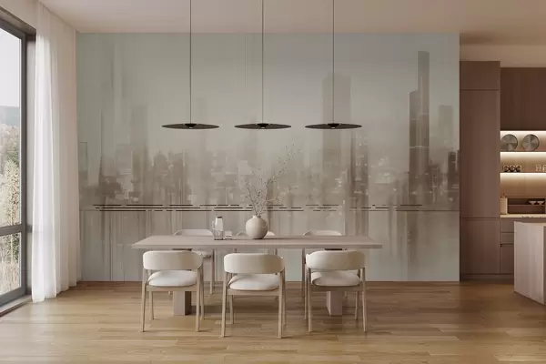Fototapetak Absztrakt, texturált városkép magas épületekkel és csíkokkal, bézs és fehér árnyalatokkal, ködös hatást keltve Nr. w09119v1
