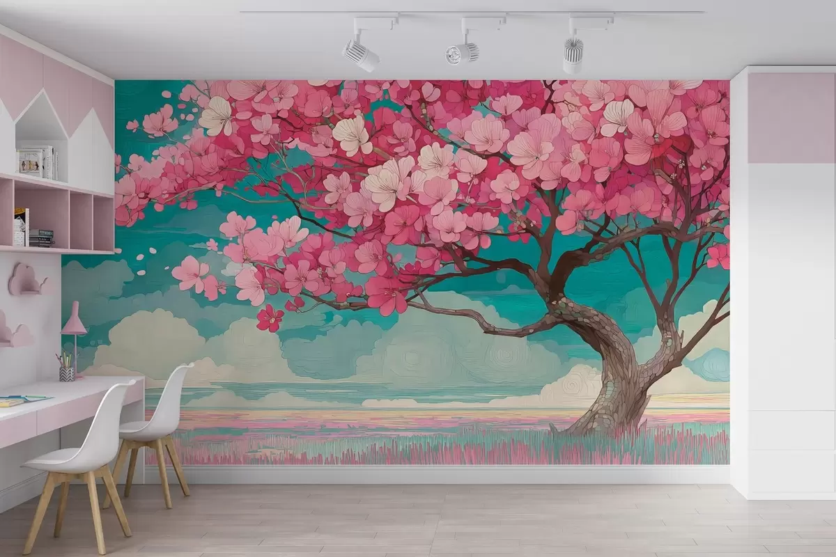 Fototapetak Rózsaszín cseresznyevirágfa hulló szirmokkal és kék éggel romantikus stílusban Nr. w09120