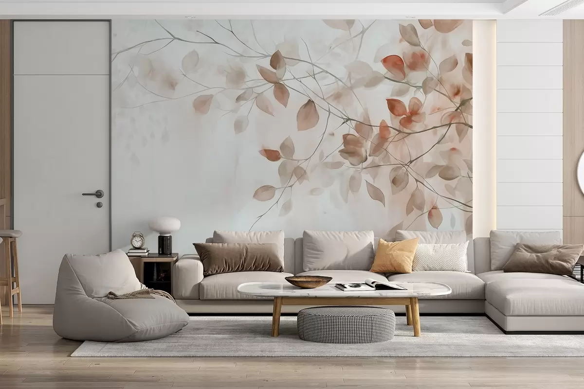 Fototapetak Szöveges akvarellfestmény barna levelek és ágak utánzata, lágy színek, finom részletek fehér háttér előtt Nr. w09133