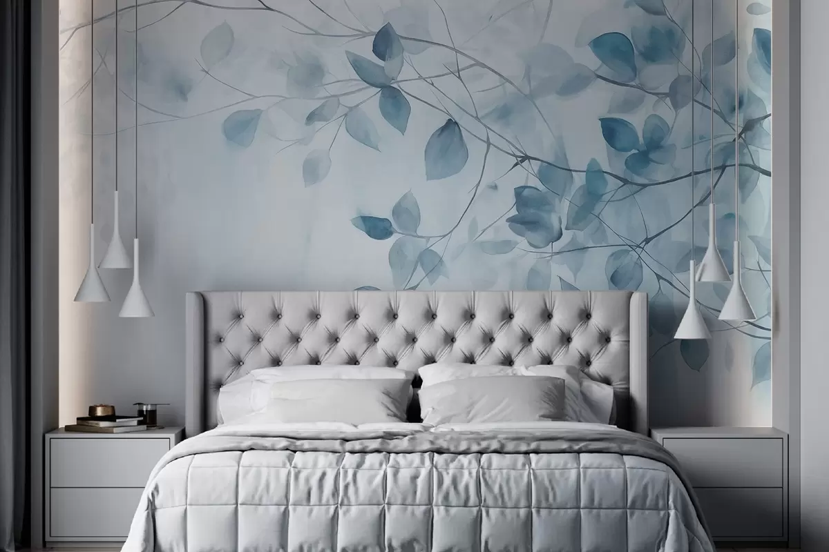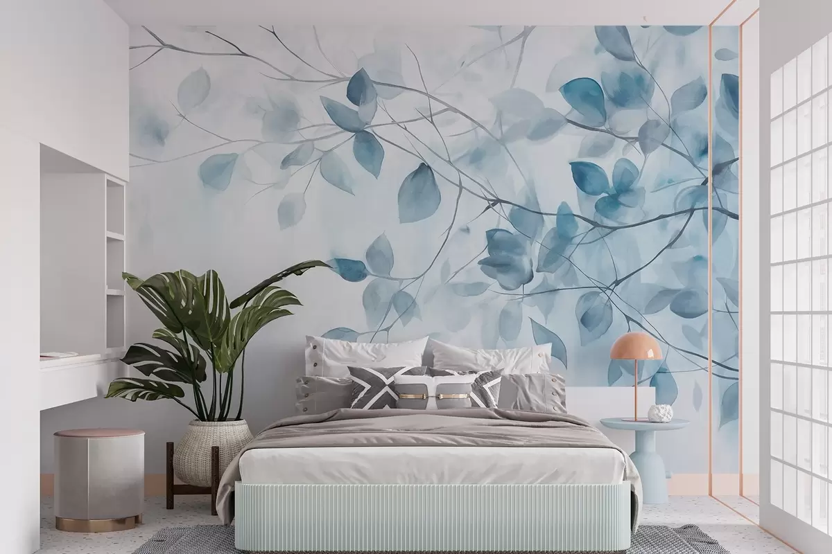 Fototapetak Texturális akvarellfestmény kék levelek és ágak utánzata, lágy színek, finom részletek fehér háttér előtt Nr. w09133v1