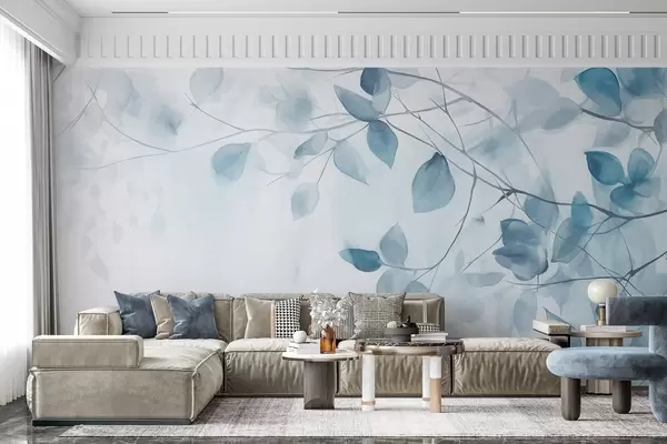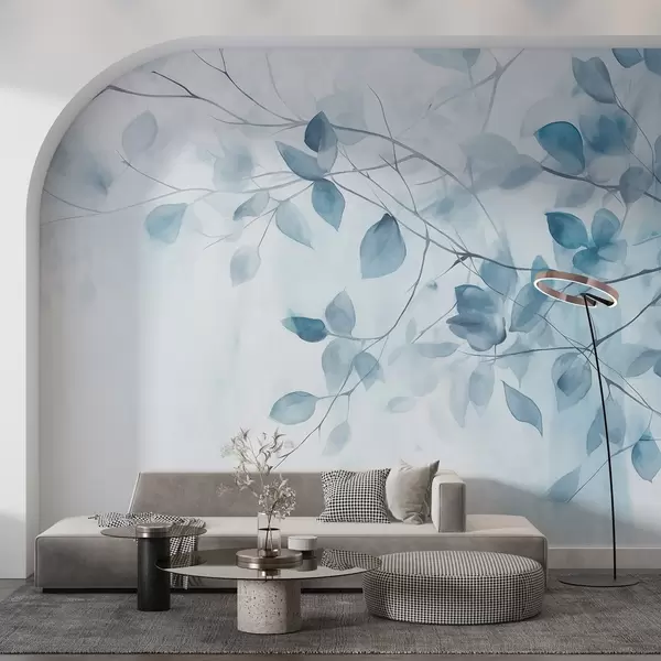 Fototapetak Texturális akvarellfestmény kék levelek és ágak utánzata, lágy színek, finom részletek fehér háttér előtt Nr. w09133v1