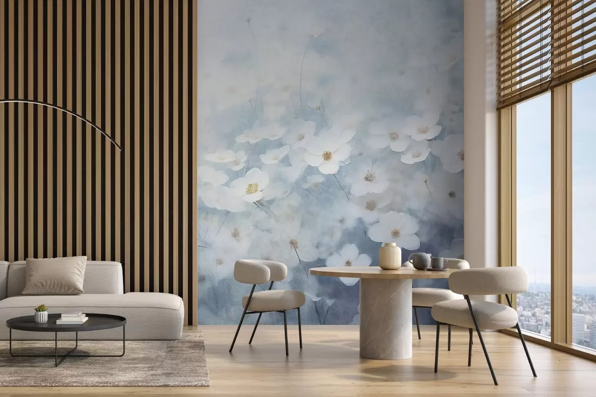 Fototapetak Fehér anemone virágok texturális mezője, lágy fókusz, álmodozó hangulat, világoskék és fehér színpaletta, tavaszi rét Nr. w09134