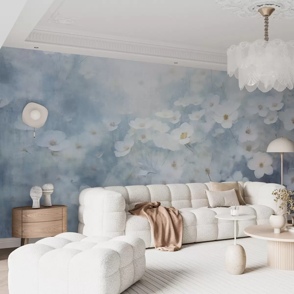 Fototapetak Fehér anemone virágok texturális mezője, lágy fókusz, álmodozó hangulat, világoskék és fehér színpaletta, tavaszi rét Nr. w09134