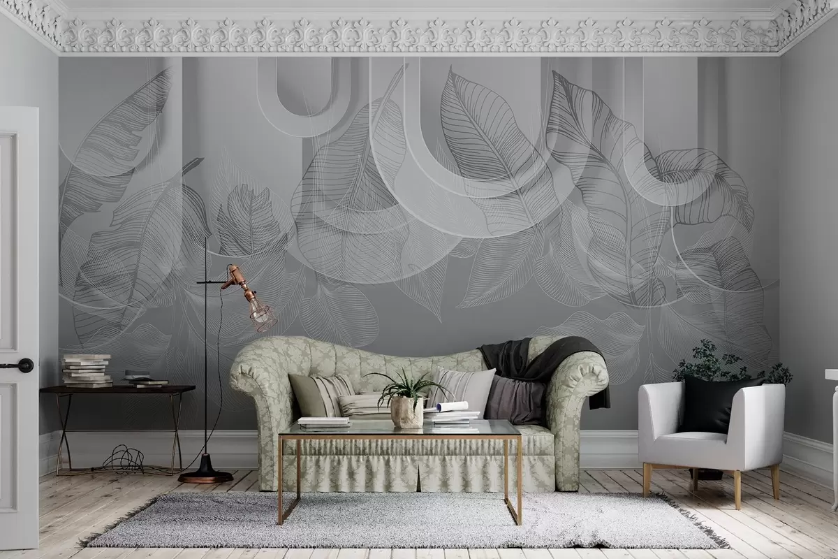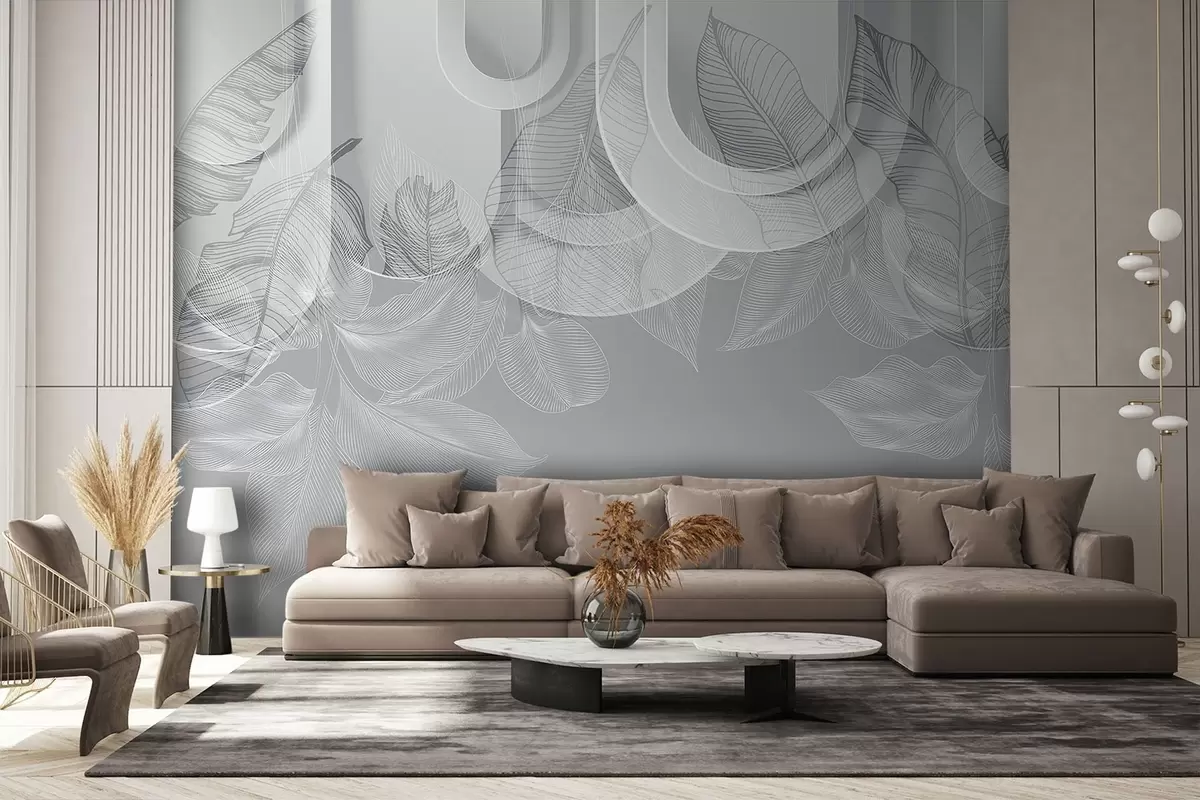 Fototapetak Absztrakt háttér szürke ívekkel és fehér trópusi levelekkel, minimalista design, elegáns és modern, semleges színpaletta Nr. w09138