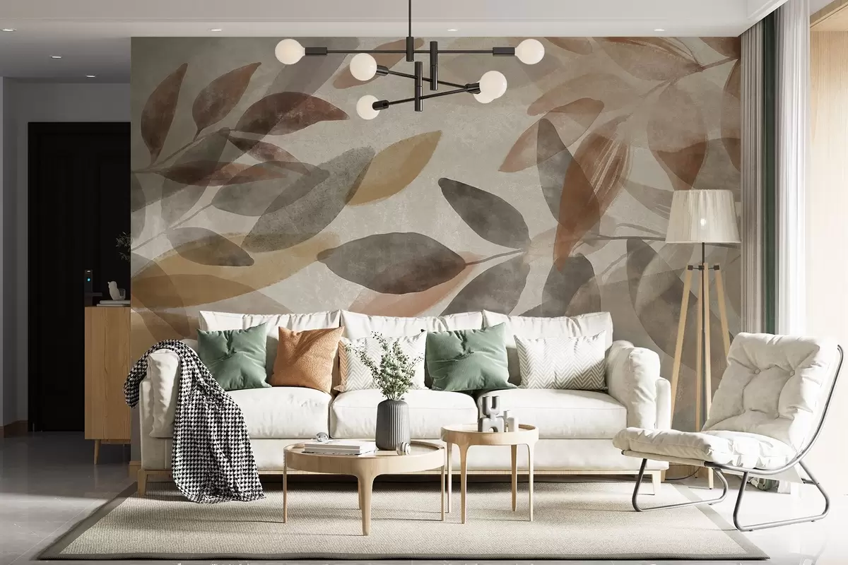 Fototapetak Absztrakt texturált levelek tompa barna, bézs és szürke tónusokban, átlátszó formák, minimalista stílus, organikus formák Nr. w09140