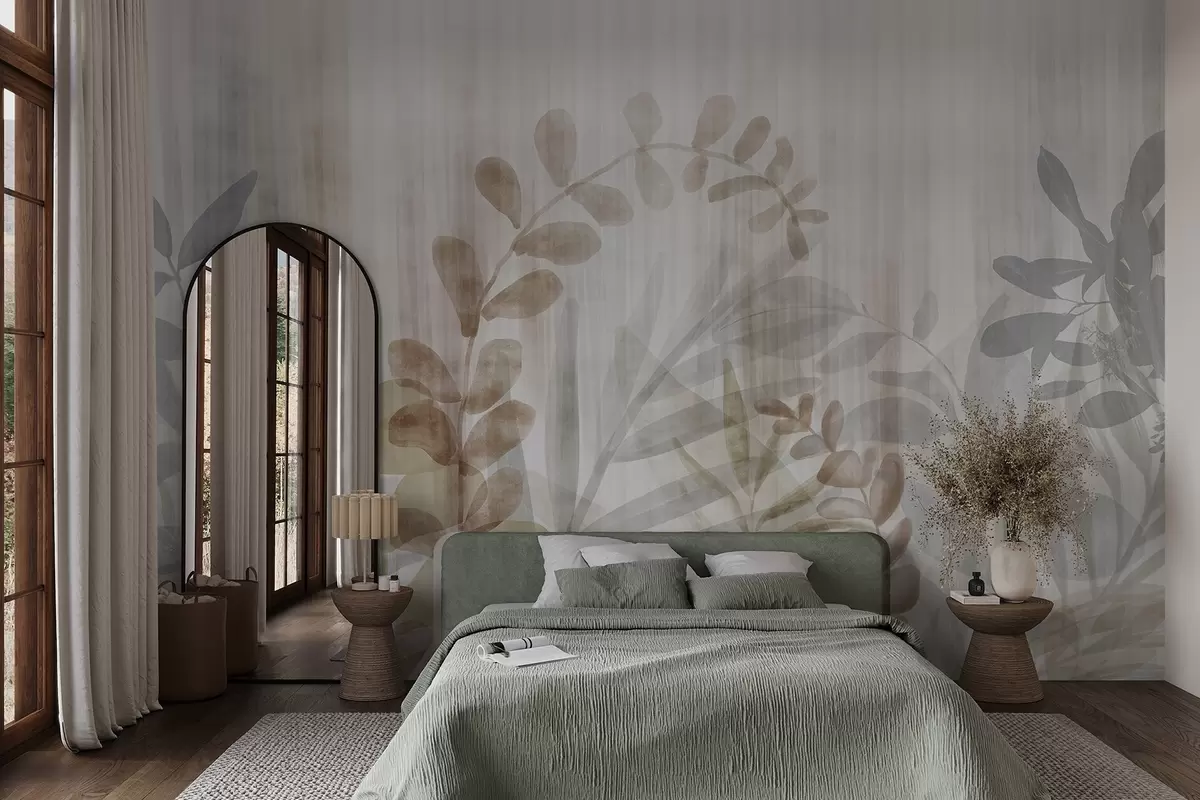 Fototapetak Akvarell festmény utánzata növények többszínű elnémult levelek, világos háttér függőleges vonalakkal, botanikai illusztráció Nr. w09146