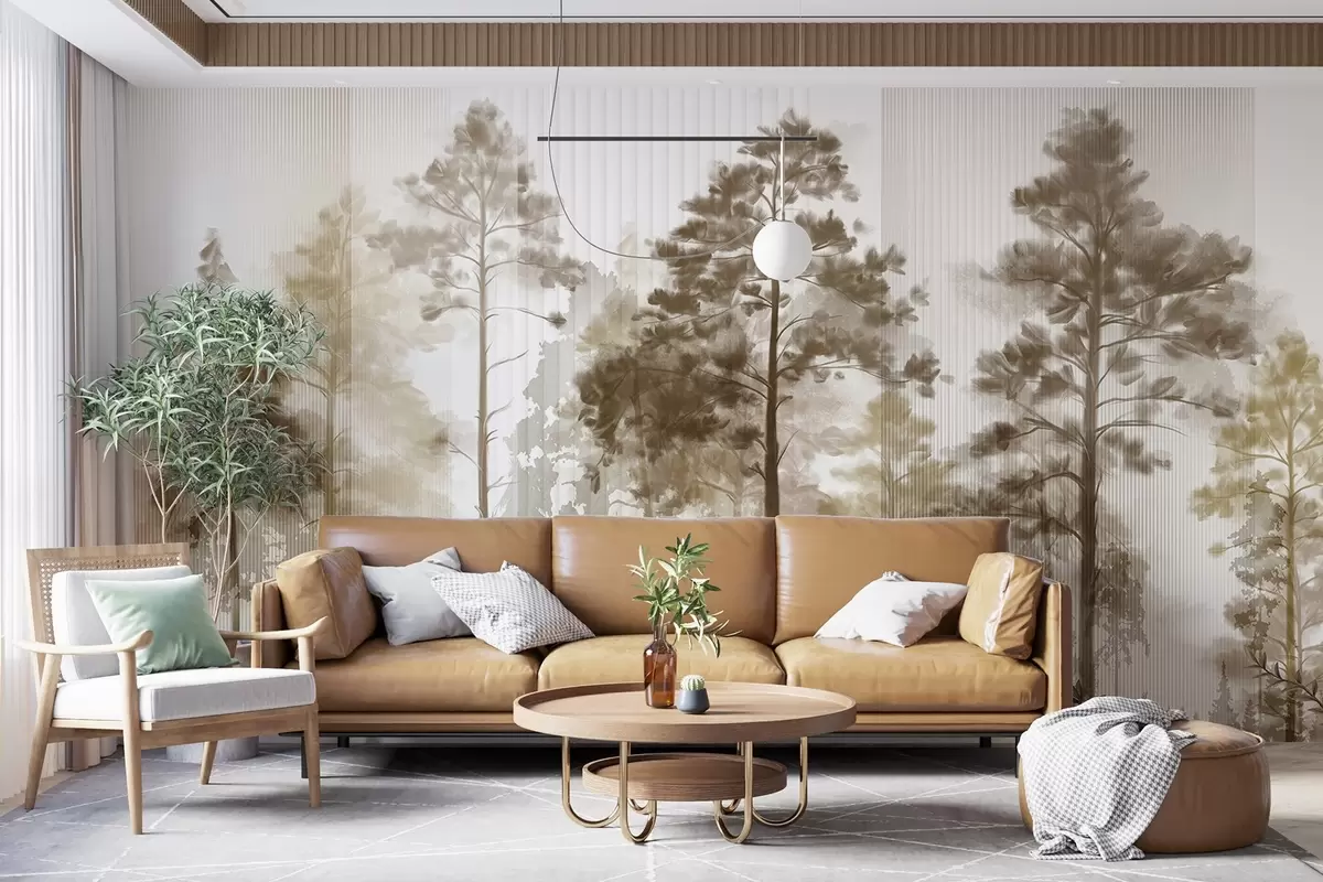 Fototapetak Sűrű erdő magas fenyőfákkal, buja bézs lombozat, ködös hangulat függőleges vonalakkal textúrákkal Nr. w09163v1