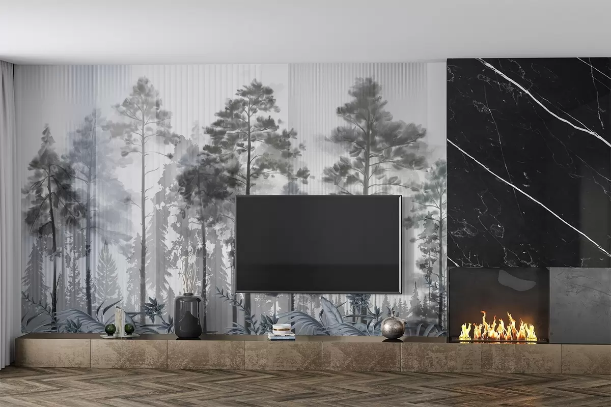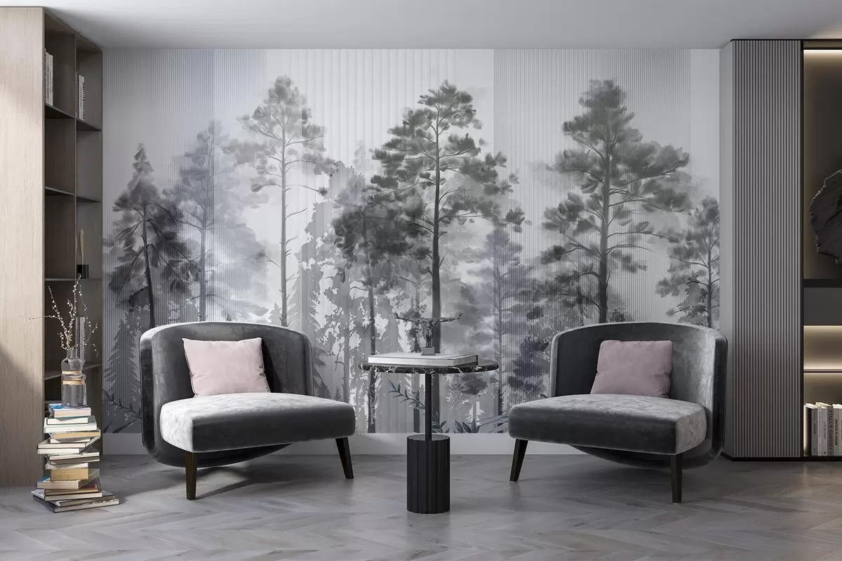 Fototapetak Egy sűrű erdő magas fenyőfákkal, buja szürke lombozat, ködös hangulat függőleges vonalakkal textúrákkal Nr. w09163v2