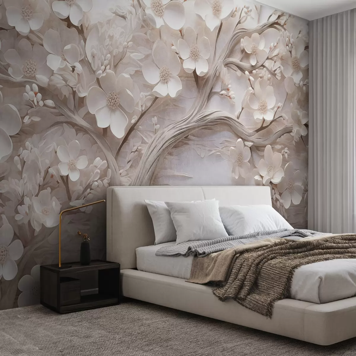 Fototapetak Texturált fa fehér virágokkal és barna törzzsel, a háttér fehér, vízszintes vonalakkal, lágy megvilágítással Nr. w09166