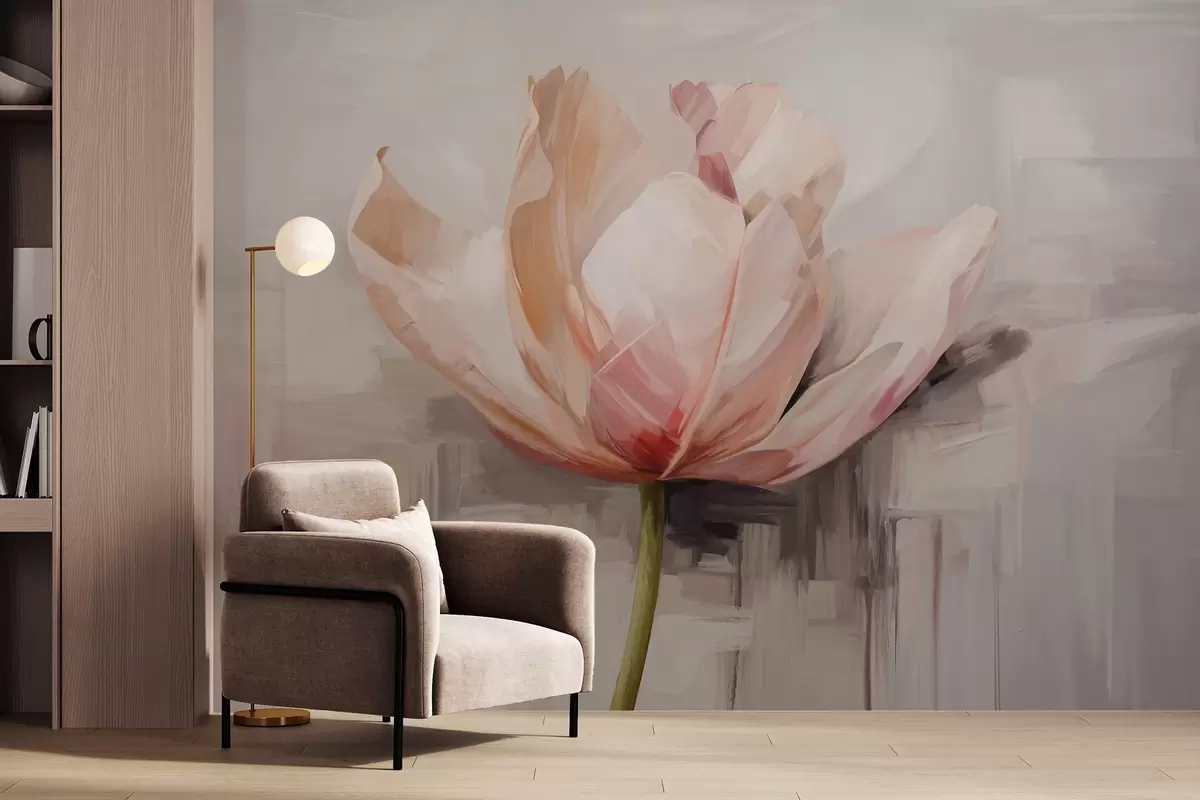 Fototapetak Rózsaszín tulipán, olajfestmény utánzat lágy ecsetvonásokkal, absztrakt háttér a szürke és a bézs pasztell árnyalataival Nr. w09187