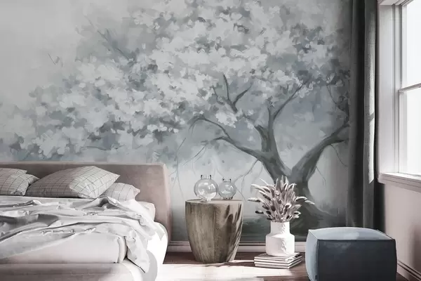 Fototapetak Absztrakt tompa kék virágzó fa teljes virágzásban, egy folyó mellett, lágy textúrájú ecsetvonásokkal és pasztell színekkel Nr. w09193v2