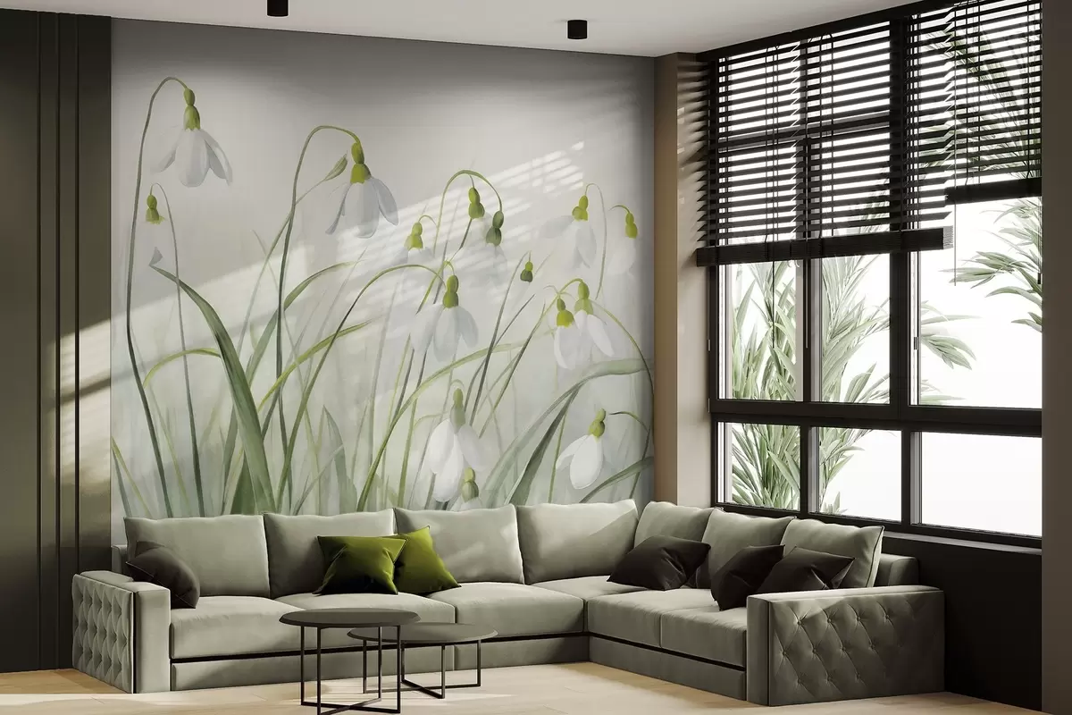 Fototapetak Hóvirágok zöld textúrájú szárakkal és levelekkel, akvarell tavaszi stílusban, finom ecsetvonásokkal Nr. w09195