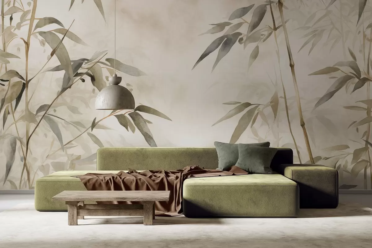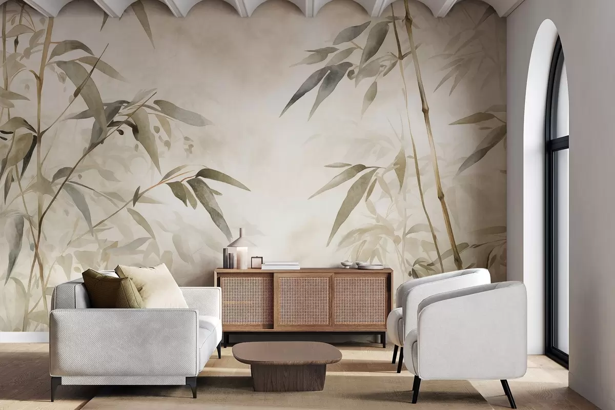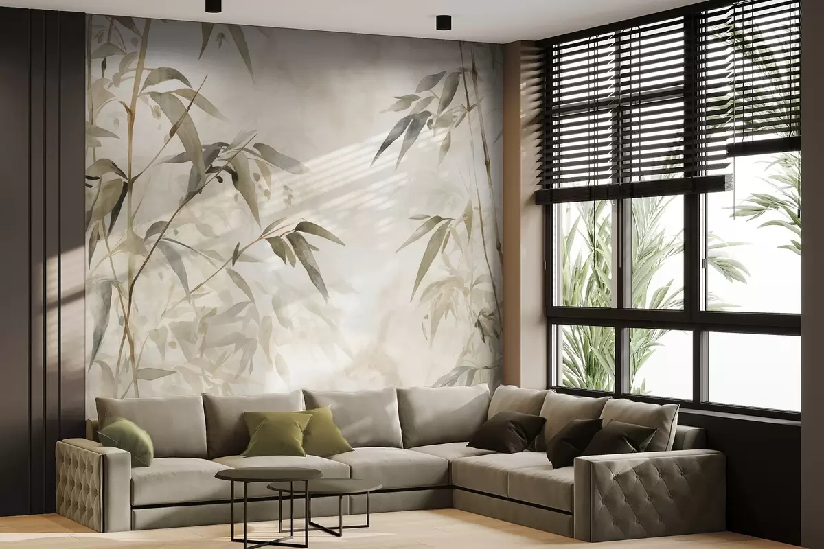 Fototapetak Bambusz textúrájú ágak levelekkel, akvarell stílusban, lágy semleges színpaletta, világos bézs háttérrel Nr. w09204