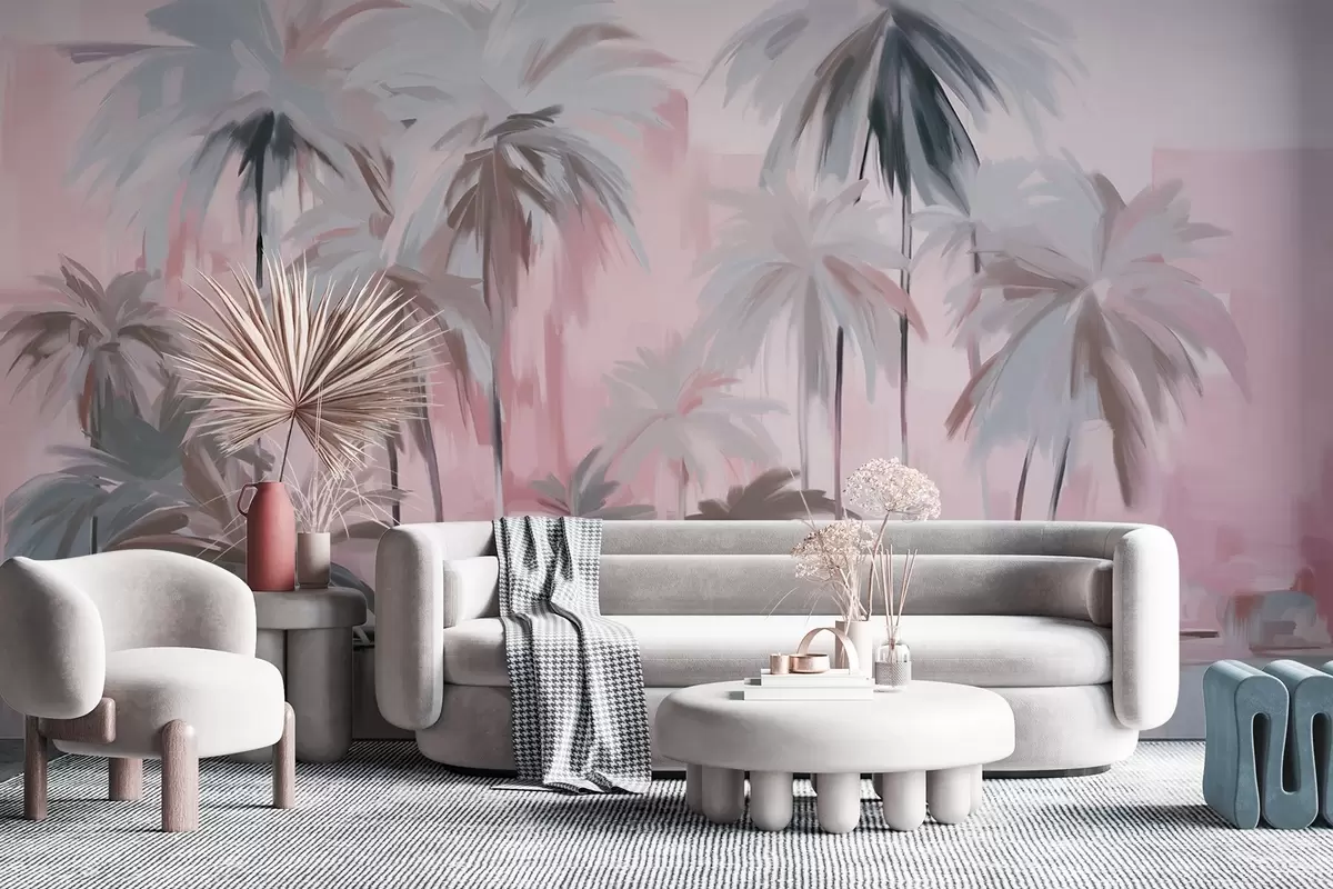 Fototapetak Absztrakt minimalista pasztell trópusi pálmafák, háttérben tompa rózsaszín és szürke árnyalatokkal Nr. w09212v1