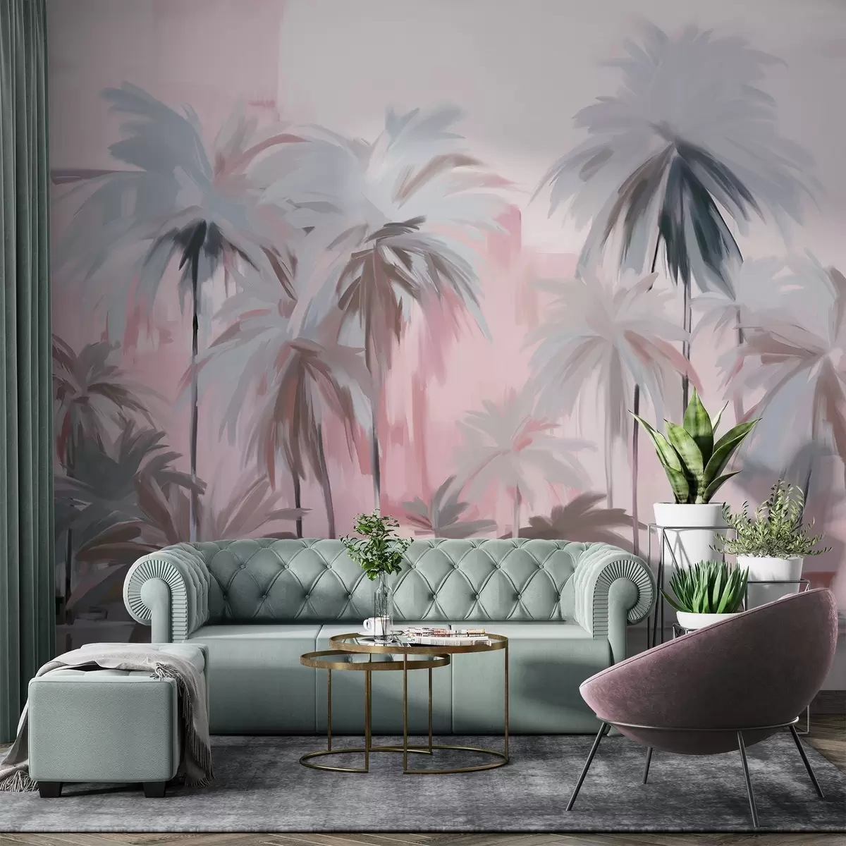 Fototapetak Absztrakt minimalista pasztell trópusi pálmafák, háttérben tompa rózsaszín és szürke árnyalatokkal Nr. w09212v1