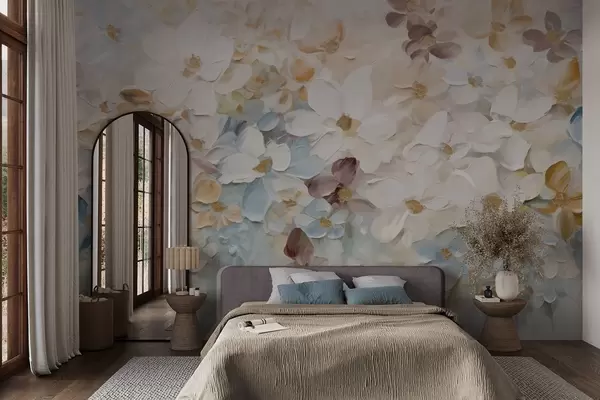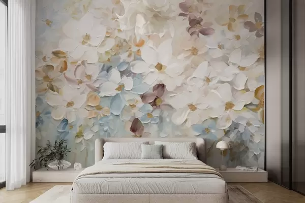 Fototapetak Olajfestmény virágoskert utánzata fehér, kék és narancssárga virágokkal, lágy ecsetvonásokkal, pasztell tompa színekkel Nr. w09236v1