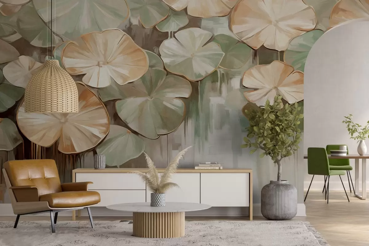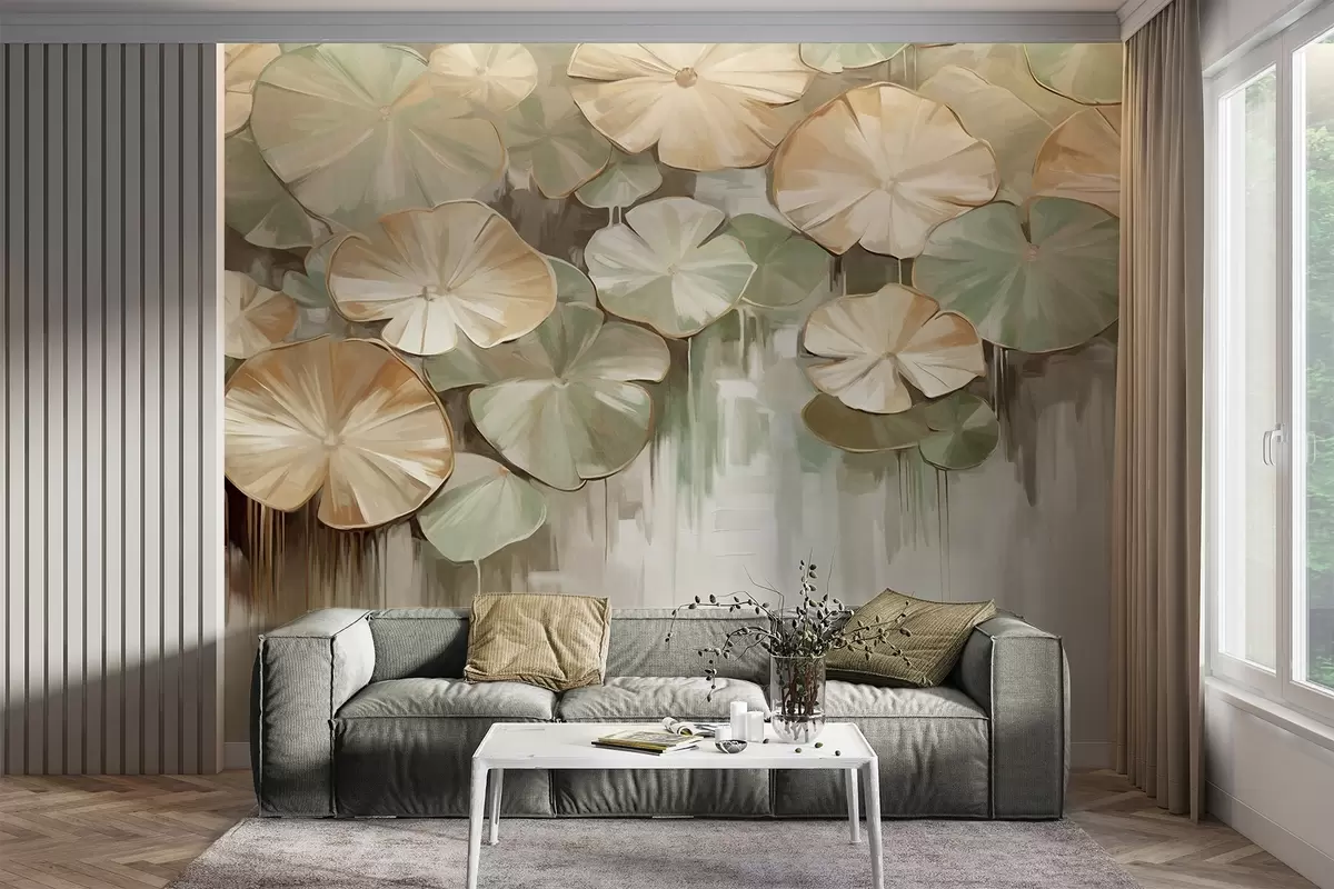 Fototapetak Texturált liliompárnák zöld és bézs színekkel egy tóban, a háttér a fehér, zöld és barna elmosódott keveréke Nr. w09255