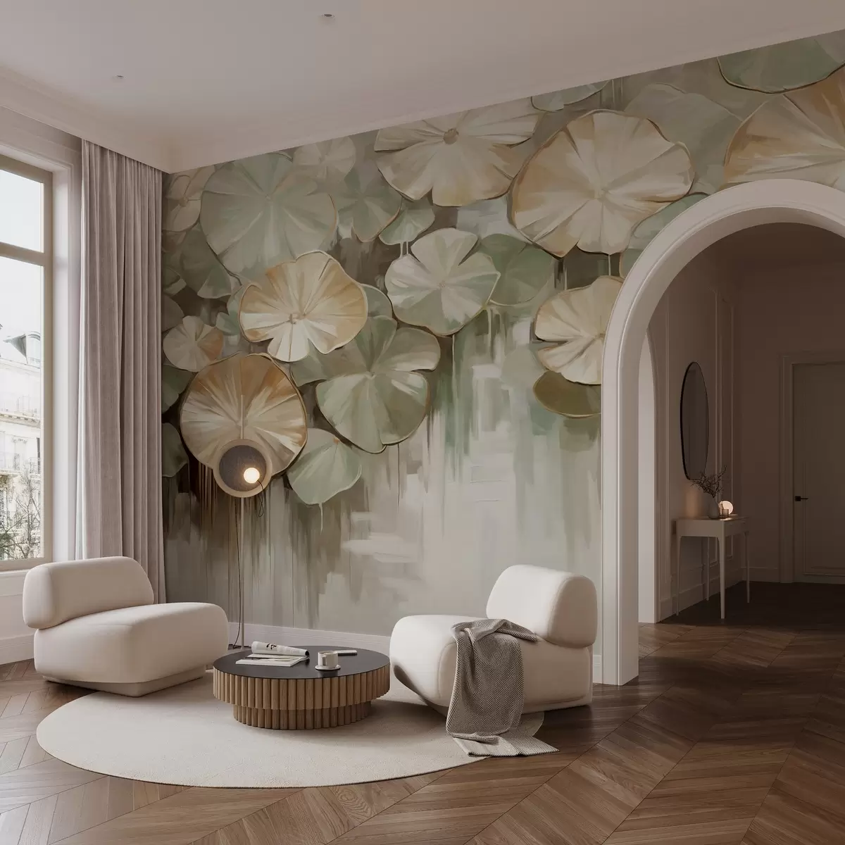Fototapetak Texturált liliompárnák zöld és bézs színekkel egy tóban, a háttér a fehér, zöld és barna elmosódott keveréke Nr. w09255