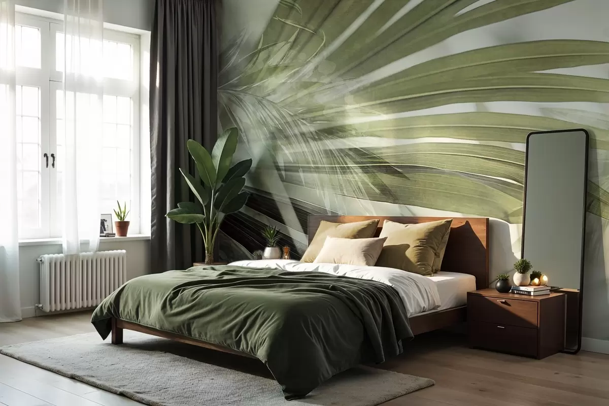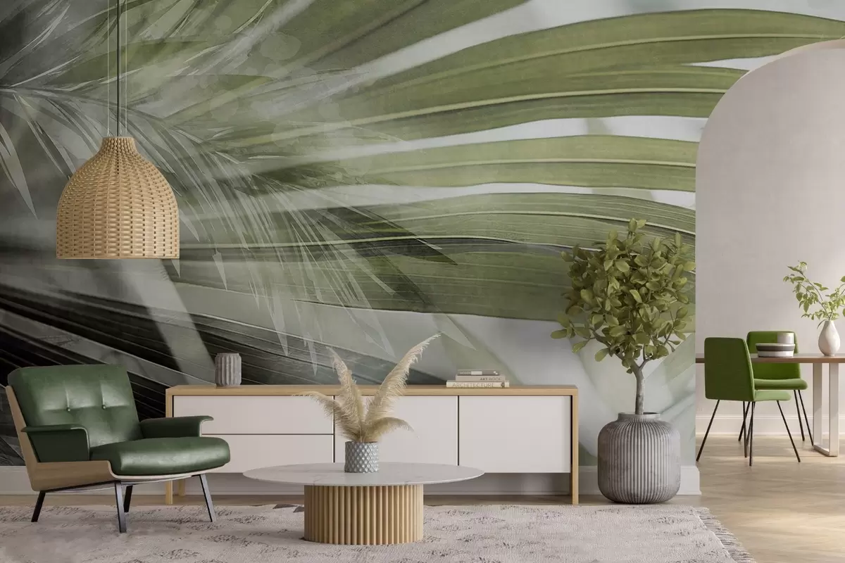 Fototapetak Világoszöld árnyalatú pálmalevelek, amelyek átfedik egymást, és réteges hatást keltenek, lágy, semleges háttér előtt Nr. w09256v1