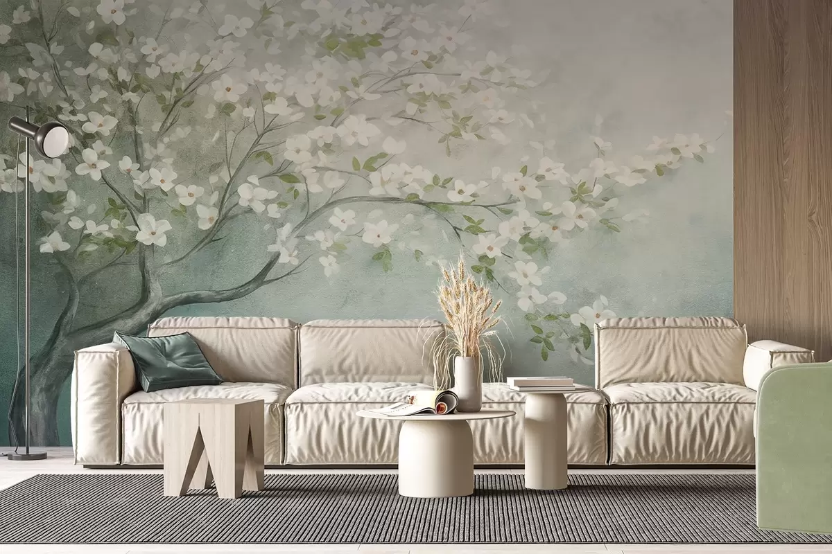 Fototapetak Virágzó fa fehér virágokkal, teljes virágzásban, szemcsés, zajos, zajos, tompa kék és zöld háttér előtt Nr. w09261