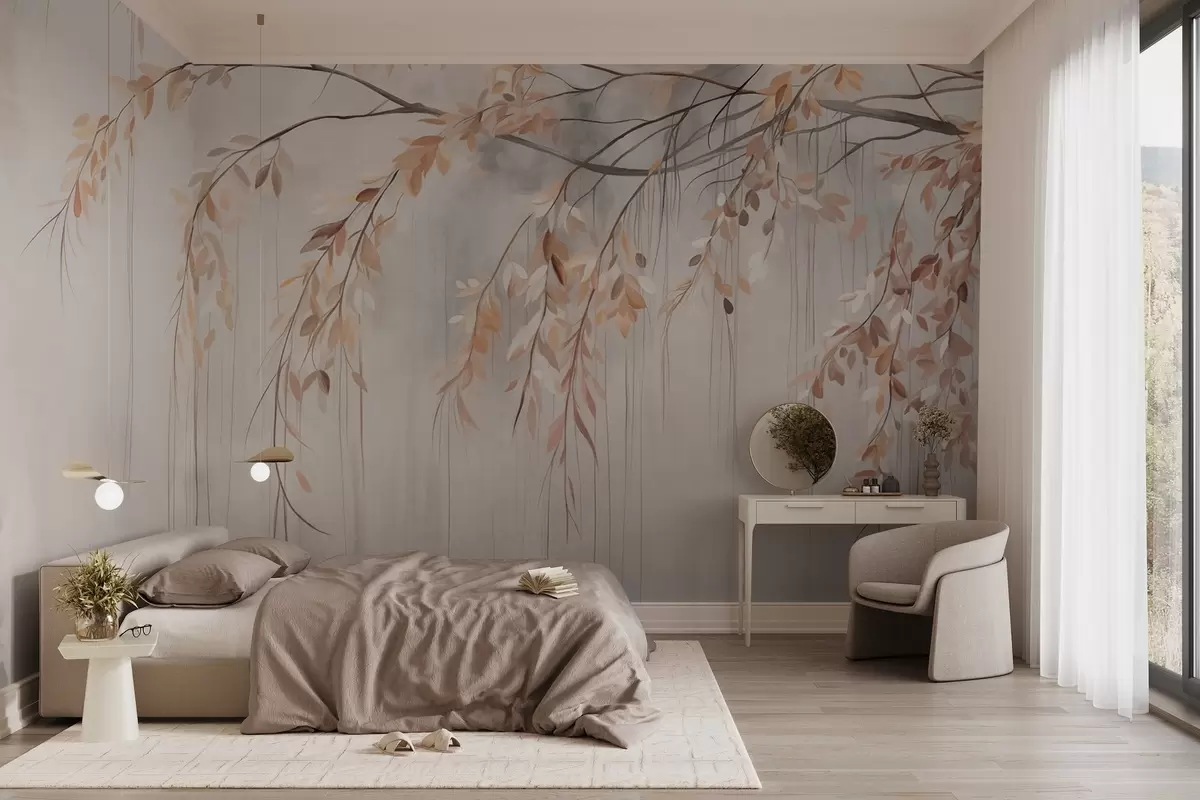 Fototapetak Egy ág világos narancssárga levelek lógnak lefelé, világosszürke textúrájú elmosódott háttér, lágy és finom stílusban Nr. w09265
