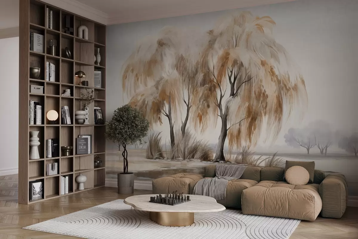 Fototapetak Barna és fehér levelű, texturált fűzfák egy tó partján, körülöttük némi fű, ködös időben Nr. w09268
