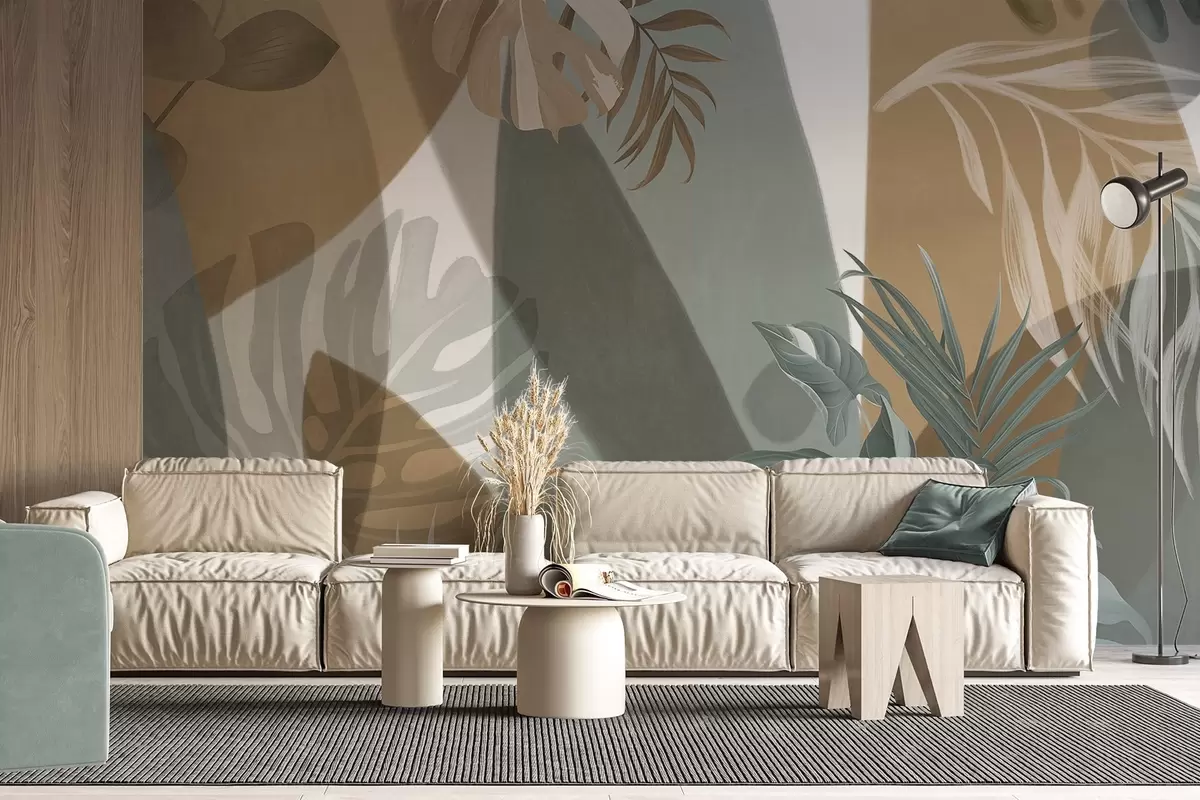 Fototapetak Monstera levelek és pálmalevelek mintázata barna, fehér és zöld színekkel, trópusi hangulat, absztrakt formák, dekoráció Nr. w09288