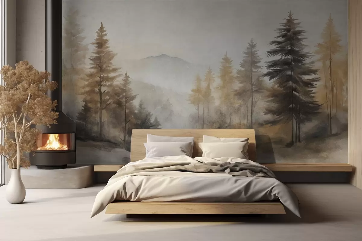 Fototapetak Texturált őszi erdő magas fenyőfákkal és hegyekkel a háttérben, a színek tompa és földes festmény stílusban Nr. w09290
