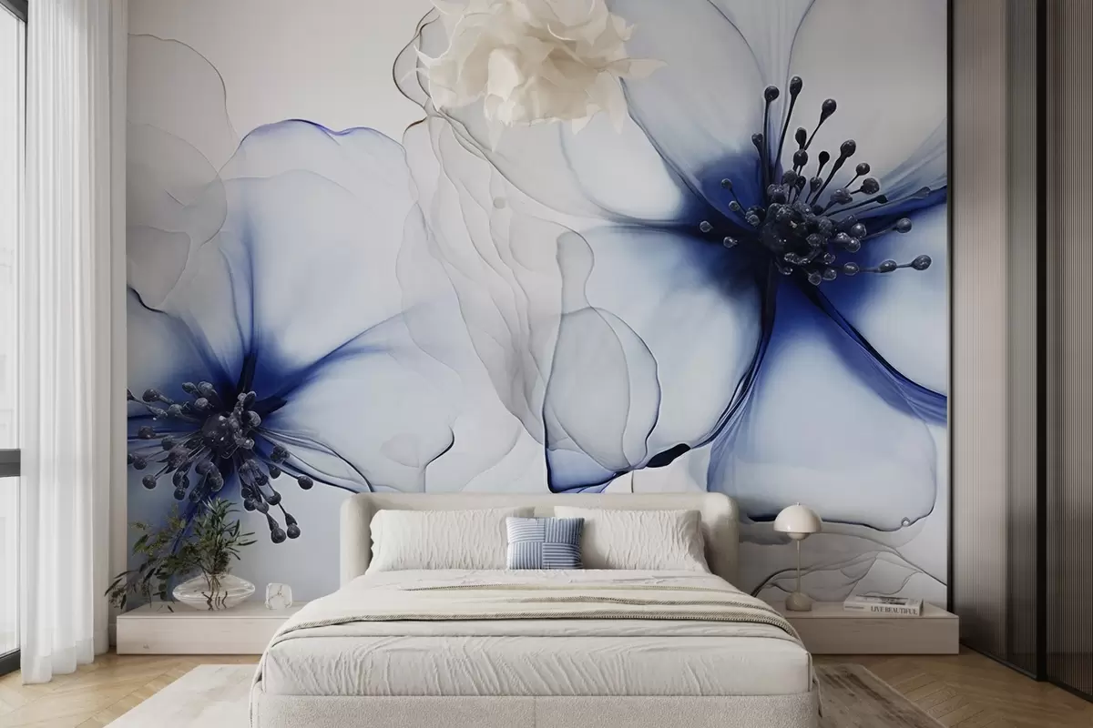 Fototapetak Két áttetsző textúrájú kék virág látható porzókkal, átfedő finom szirmokkal és lágy áramló textúrával Nr. w09295v1