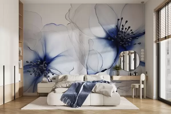 Fototapetak Két áttetsző textúrájú kék virág látható porzókkal, átfedő finom szirmokkal és lágy áramló textúrával Nr. w09295v1