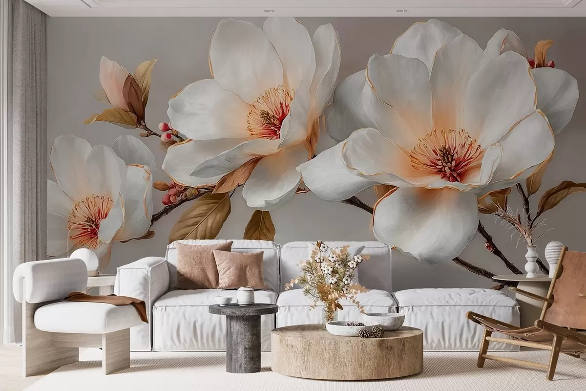 Fototapetak Finom virágok egy ágon, pasztell tónusú, narancssárga középponttal Nr. w09299