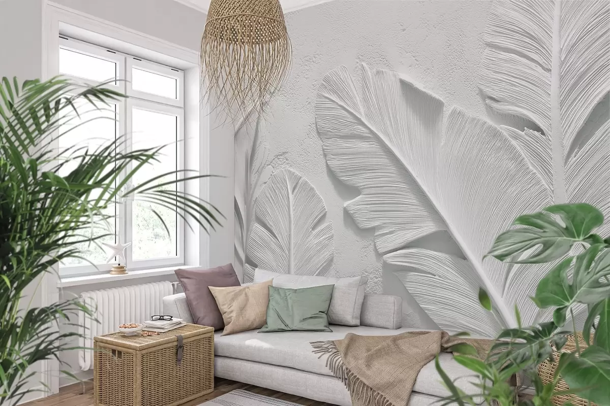 Fototapetak Texturált szürke levelek a háttérben hamis gipsz domborművekkel Nr. w09307