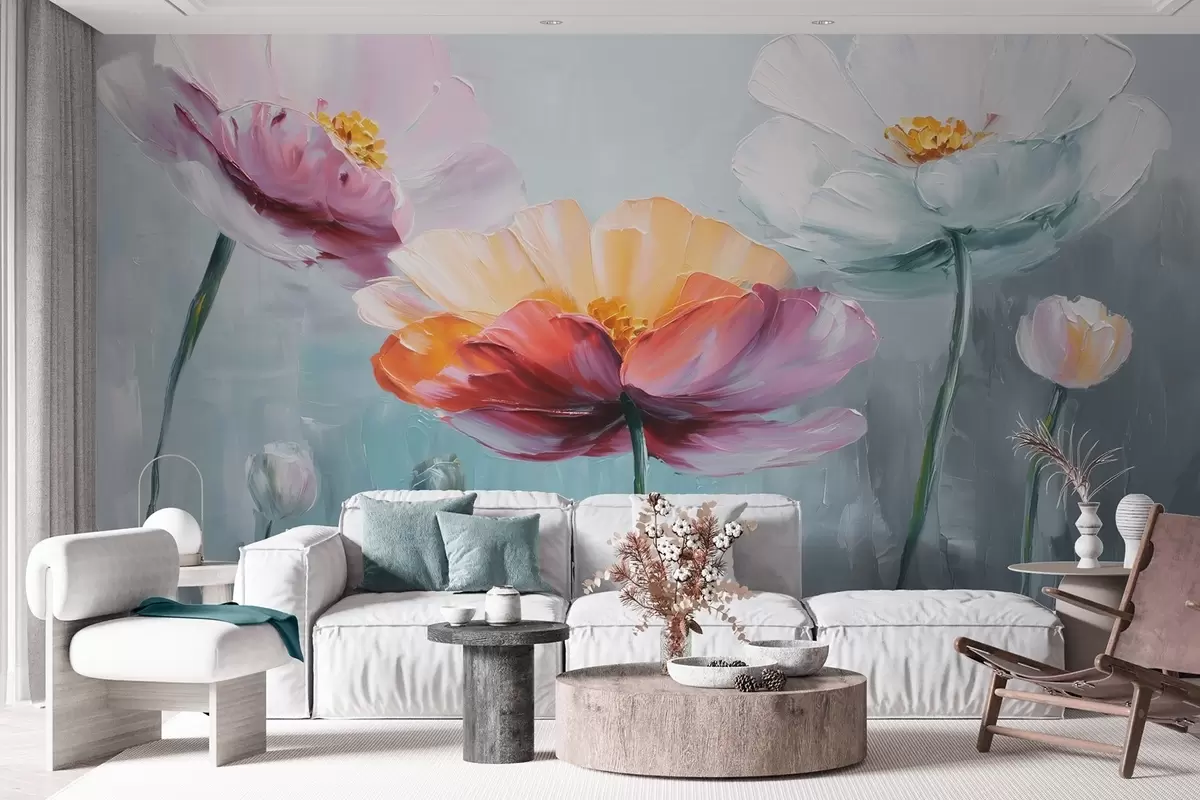 Fototapetak Fényes virágok olajfestmény technikával kék háttéren Nr. w09310
