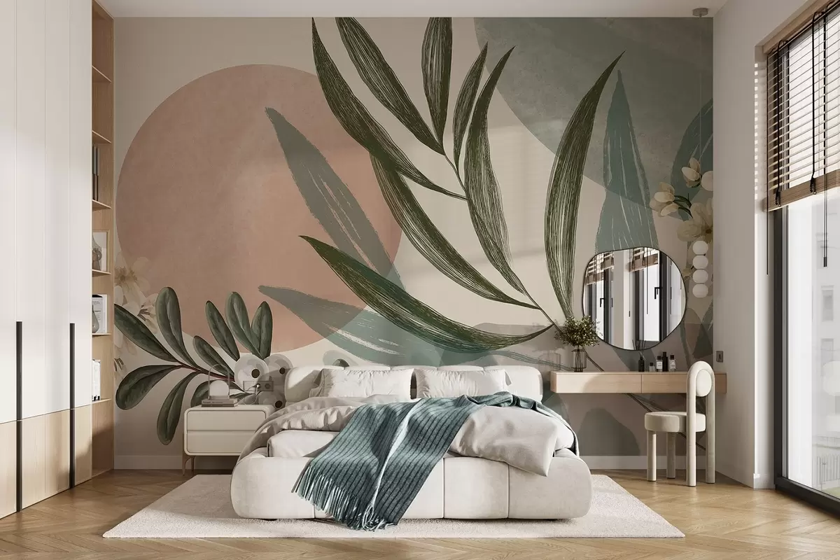 Fototapetak Absztrakt botanikai művészet zöld pálmalevelekkel és fehér bogyókkal, tompa földszínekben pompázó formák hátterében Nr. w09312