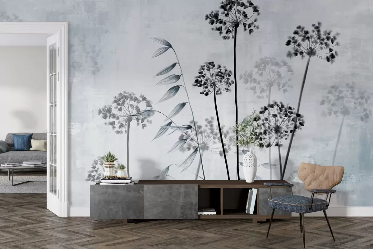 Fototapetak Szárított virágok rajz hosszú szárakkal, monokróm paletta, texturált, világosszürke háttér előtt, botanikai illusztráció Nr. w09314
