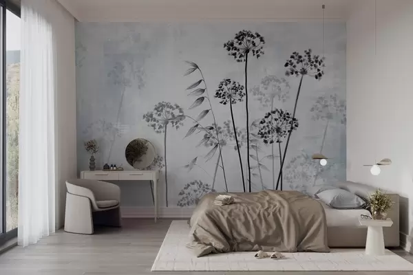 Fototapetak Szárított virágok rajz hosszú szárakkal, monokróm paletta, texturált, világosszürke háttér előtt, botanikai illusztráció Nr. w09314