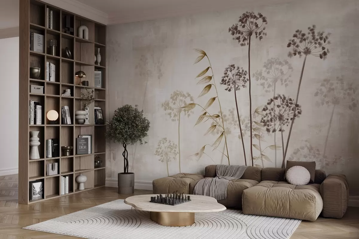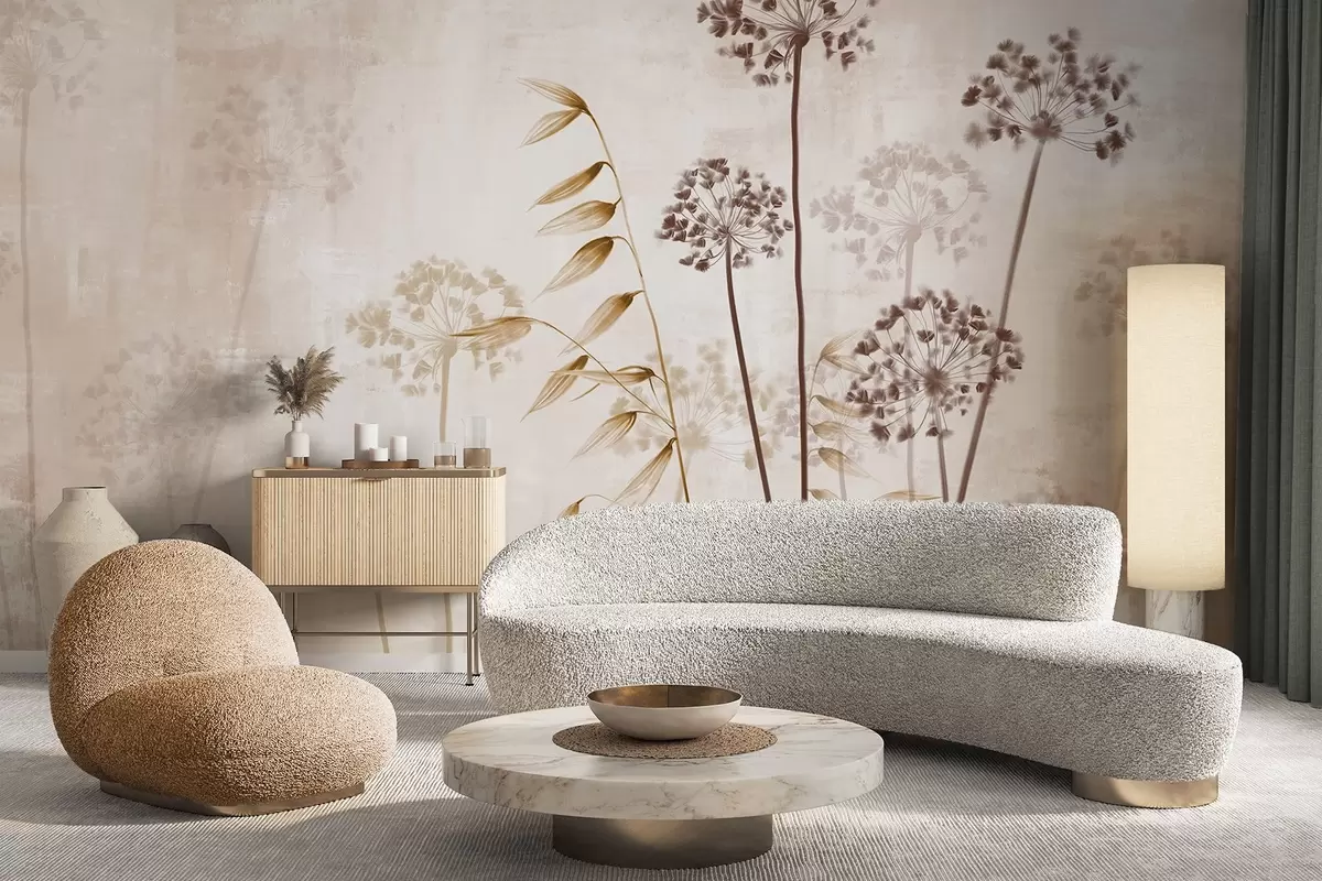 Fototapetak Szárított virágok rajz hosszú szárakkal, monokróm paletta, texturált, világos bézs háttér előtt, botanikai illusztráció Nr. w09314v1