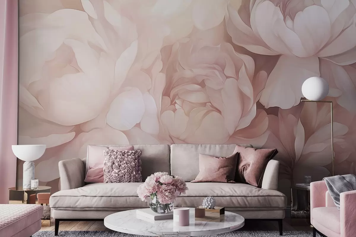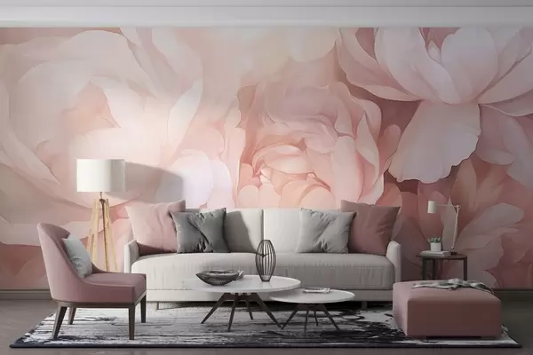 Fototapetak Világos pasztell rózsaszínű pünkösdi rózsák puha, textúrált finom szirmokkal, szorosan egymás mellé rendezve, sűrű virágművészetet, lágy megvilágítást teremtve Nr. w09319