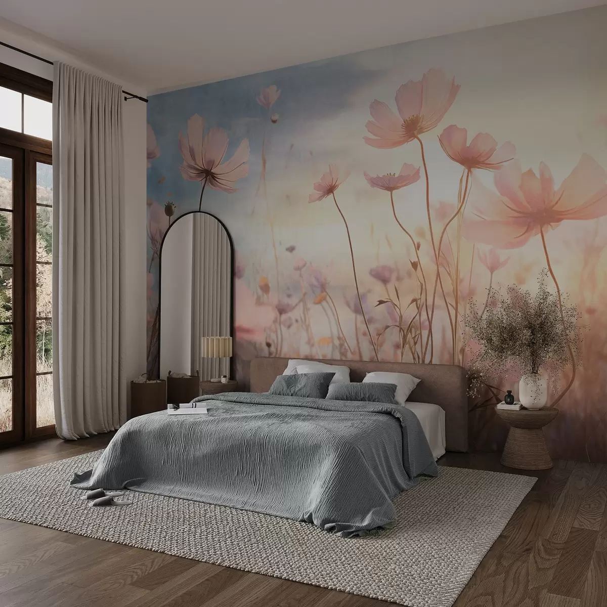 Fototapetak Egy mező rózsaszínű, hosszú szárú, texturált virágokkal, lágy kék és sárga égbolt előtt, álomszerű hangulatot teremtve Nr. w09320