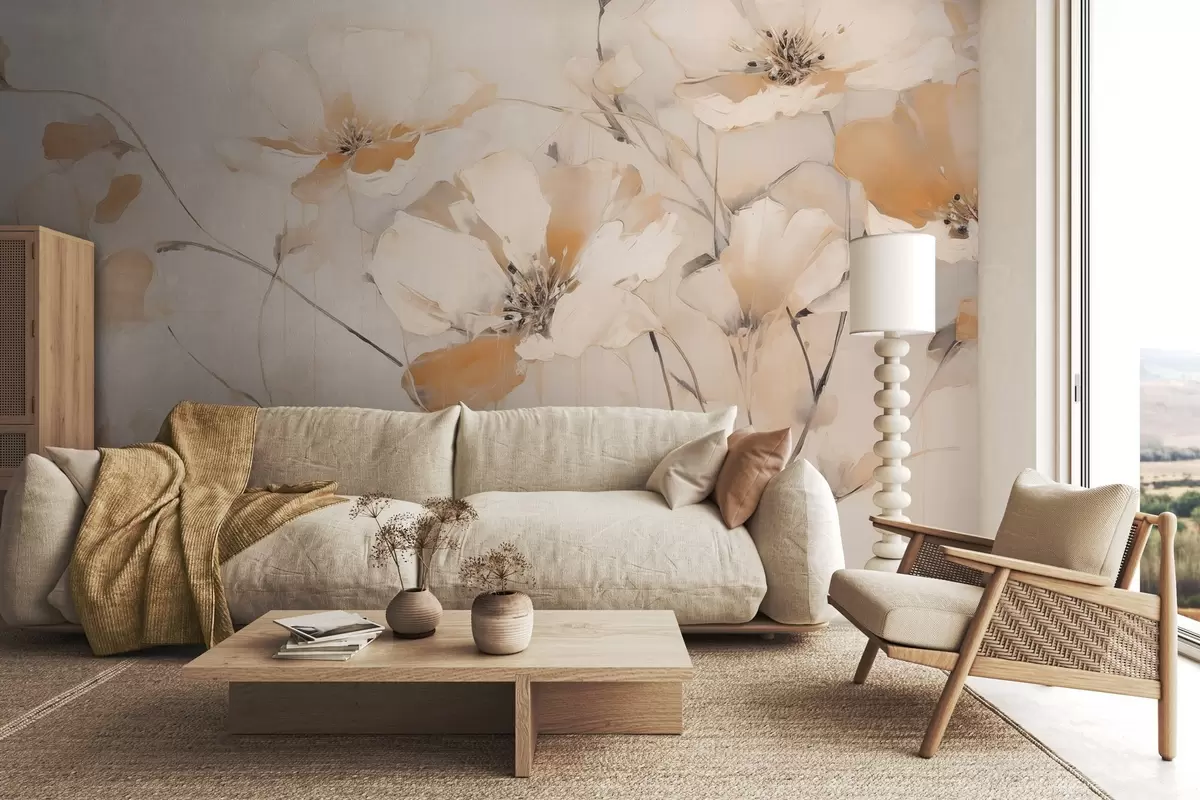 Fototapetak Fehér és narancssárga textúrájú virágok hosszú szárakkal, világos háttér, lágy színek, elegáns kompozíció, finom ecsetvonások Nr. w09335