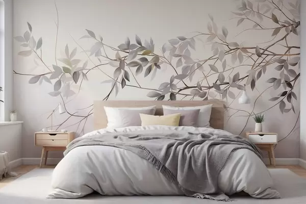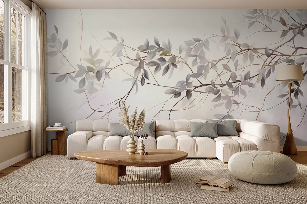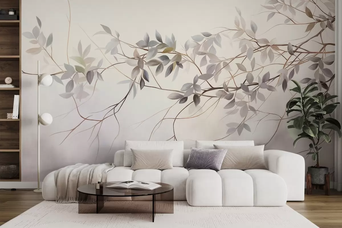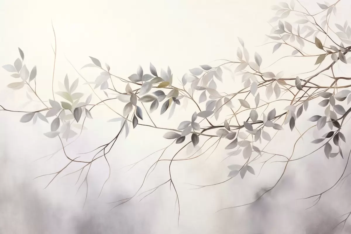 Fototapetak Finom textúrájú ágak, halvány szürke, lila és zöld levelekkel, lágy, elmosódott háttér előtt. Nr. w09336