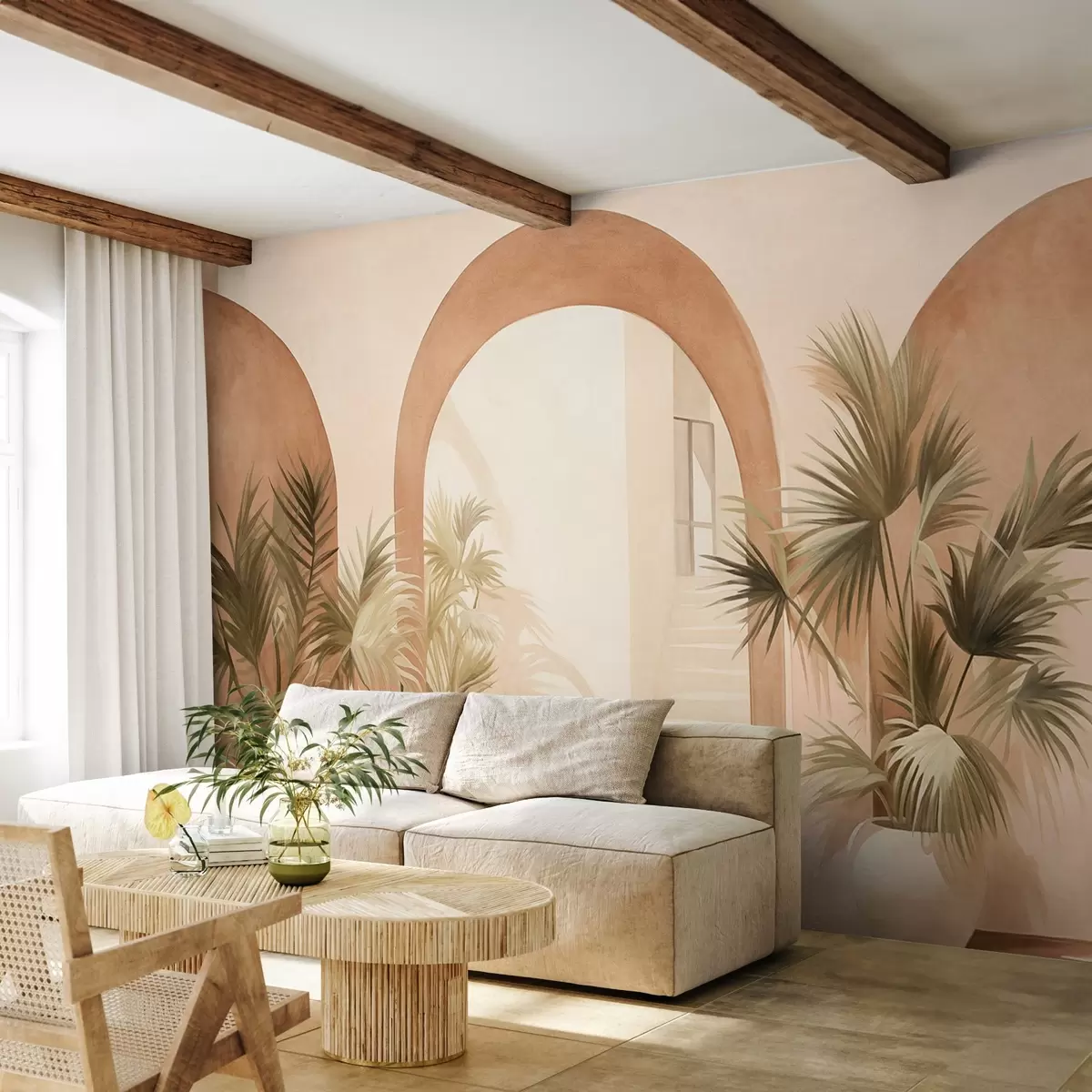 Fototapetak Texturált boltívek cserepes növényekkel, világos bézs színpaletta, minimalista design, lépcsőház a háttérben Nr. w09339
