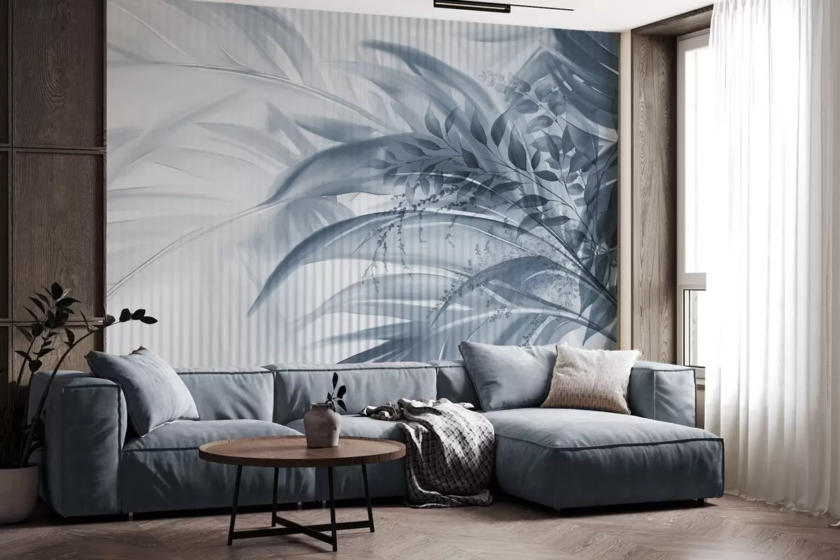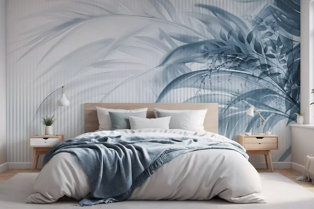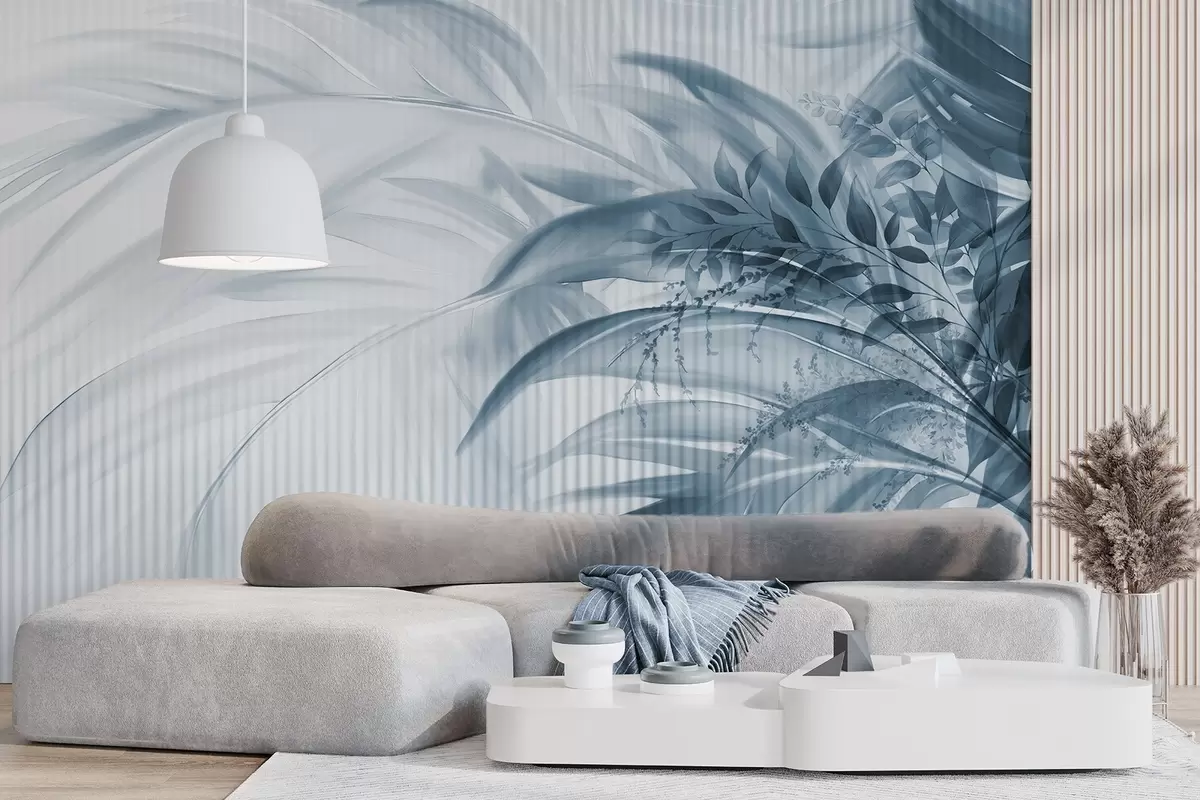 Fototapetak Pálma trópusi kék levelek fehér csíkos háttérrel, lágy megvilágítás, finom ecsetvonások, organikus formák Nr. w09343v1