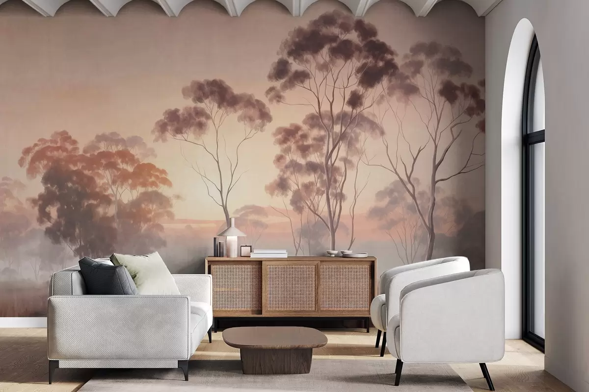 Fototapetak Egy táj eukaliptusz fák egy mezőn, pasztell rózsaszín és narancssárga ég, egy könnyű köd, festmény texturált stílusban Nr. w09367