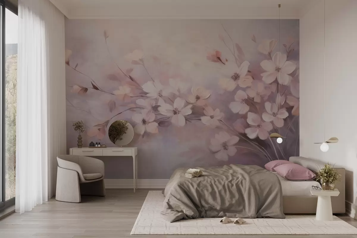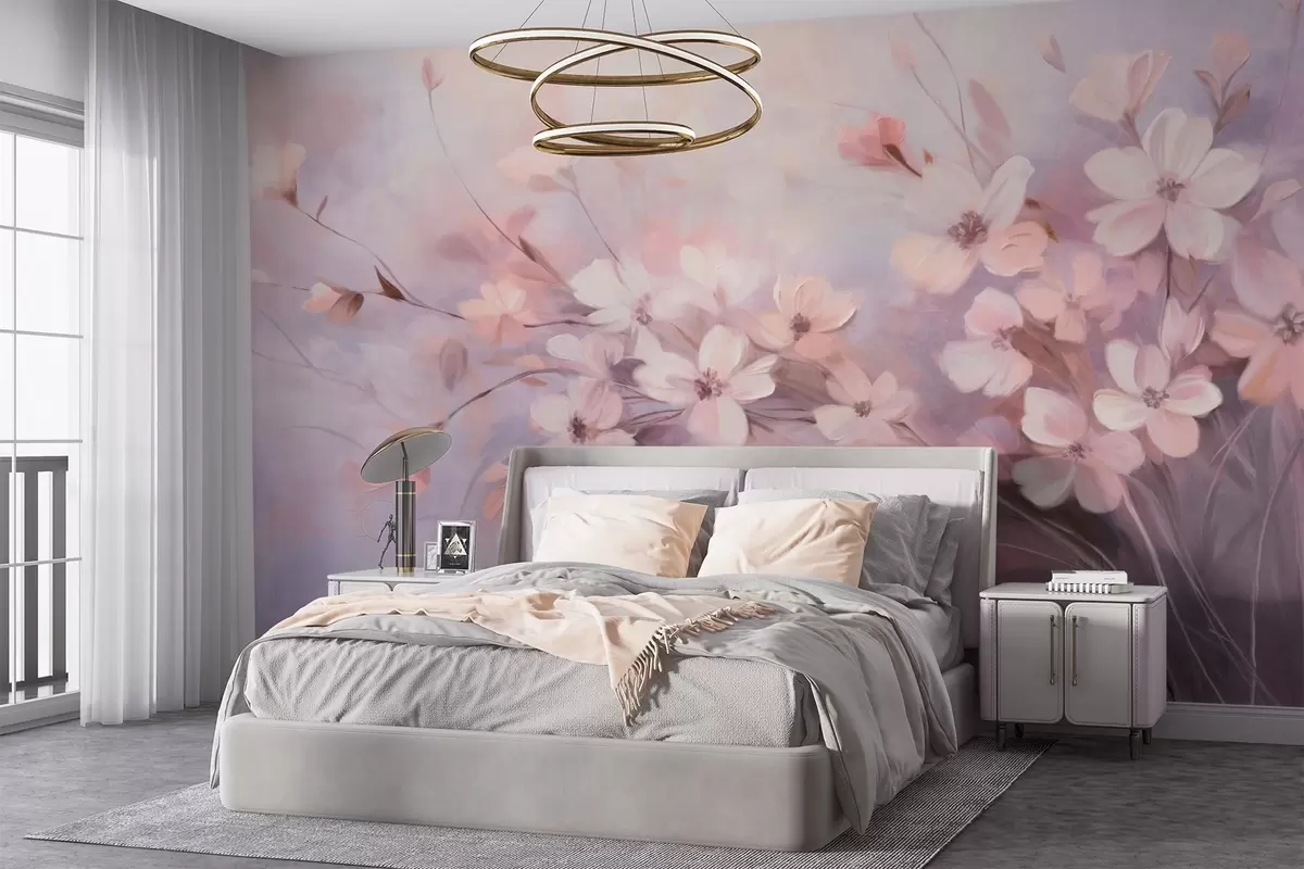 Fototapetak Virágdísz finom virágokkal, lágy, elmosódott szélekkel, levendula és világos rózsaszín árnyalatú pasztell háttér előtt Nr. w09369