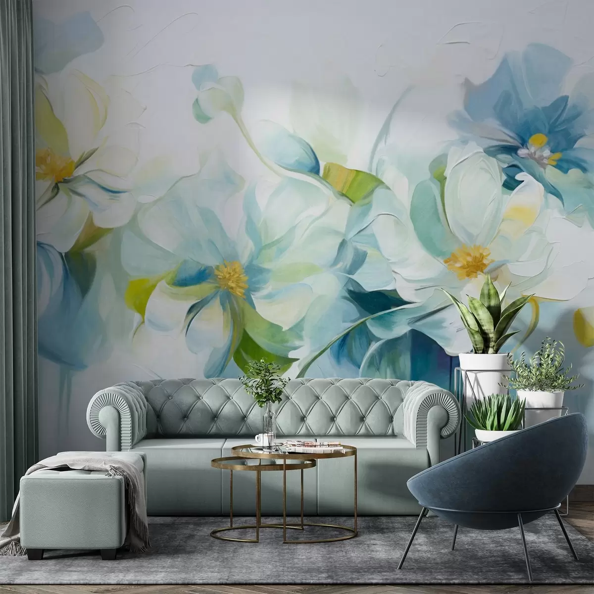 Fototapetak Absztrakt fehér és kék virágok sárga virágporral és zöld levelekkel, fehér háttérben, texturált festmény stílusban Nr. w09372