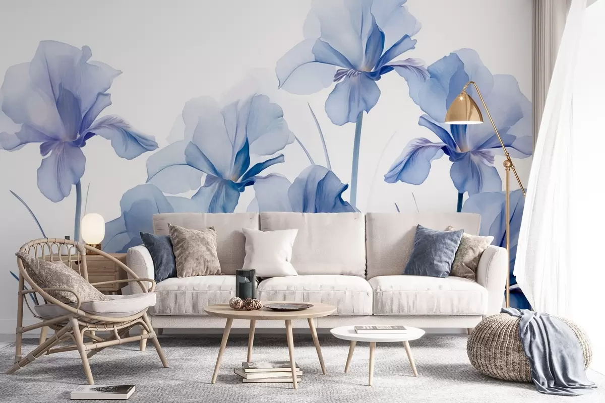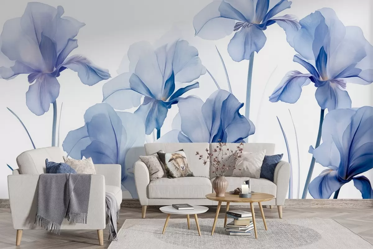 Fototapetak Kék írisz virágok áttetsző szirmokkal és hosszú szárakkal, sorba rendezve kék háttér előtt, lágy és texturált Nr. w09379